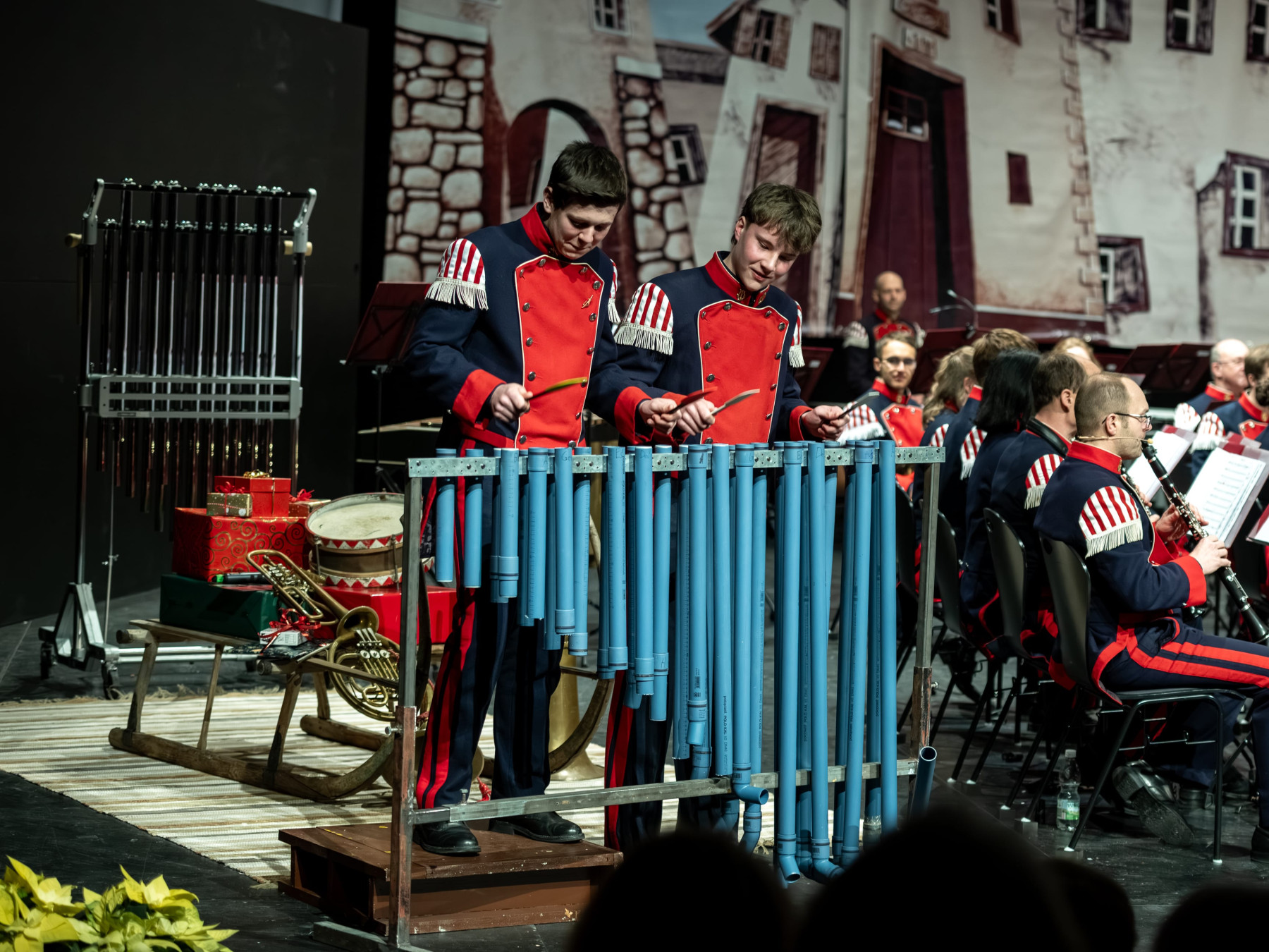 Deshalb hatten es sich die Schlagwerker Michael Seywald und Bastian Mühlbacher zur Aufgabe gemacht mit Materialien, welche in ihrer Grundbestimmung eigentlich für andere Zwecke vorgesehen sind, zu musizieren. Dafür haben die Beiden auf einem Gestell ca. 20 Meter Abflussrohr unterschiedlicher Längen verbaut und feinsäuberlich auf 442 Frequenz in Herz gestimmt. Zwei Teigkarten oder Teigschaber aus der Küche dienten als Schlägel. Mit dem von ihnen auf den Namen „Xylosyphon“ getauften Instrument kamen sie an den Klang eines echten Xylophons ziemlich nahe heran.