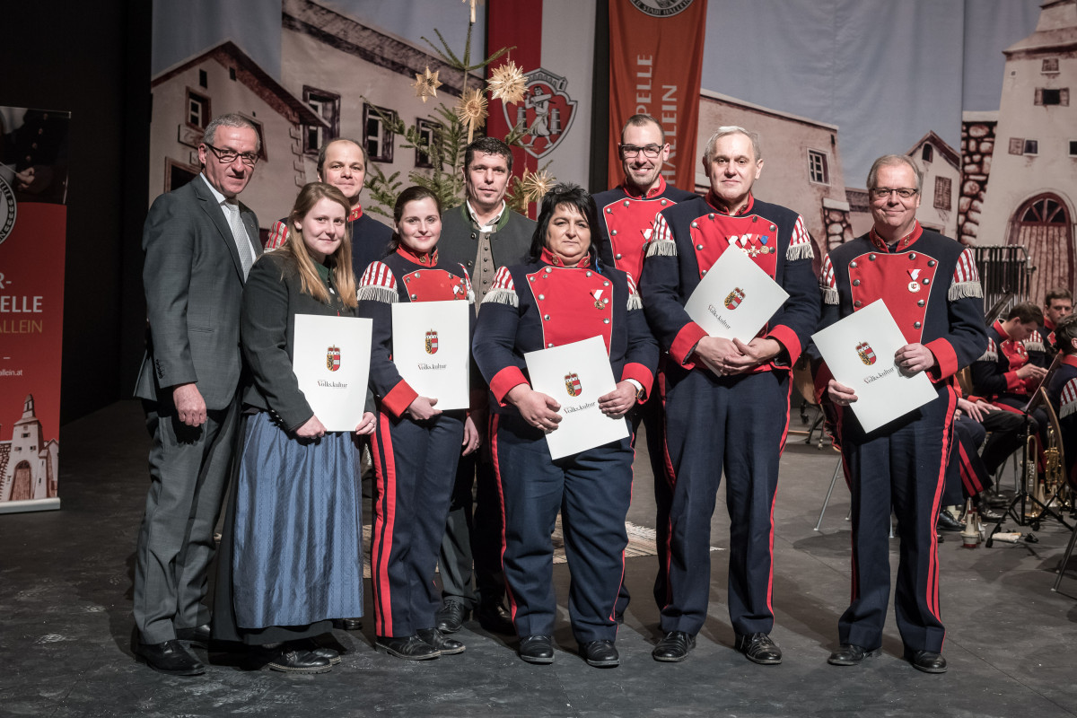 Die Überreichung der Ehrungen wurde von Bürgermeister Gerhard Anzengruber, Bezirksobmann des Tennengauer Blasmusikverbandes Armin Keuschnigg, Obmann Stefan Rußegger und Kapellmeister Hermann Seiwald vorgenommen.