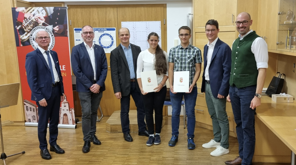 Die Urkunden wurden unter großem Applaus von Landeshauptmann-Stellvertreter Dr. Christian Stöckl, Bürgermeister Alexander Stangassinger, Kapellmeister Mag. Hermann Seiwald, Vize-Bürgermeister Florian Scheicher und Obmann Ing. Stefan Rußegger überreicht.