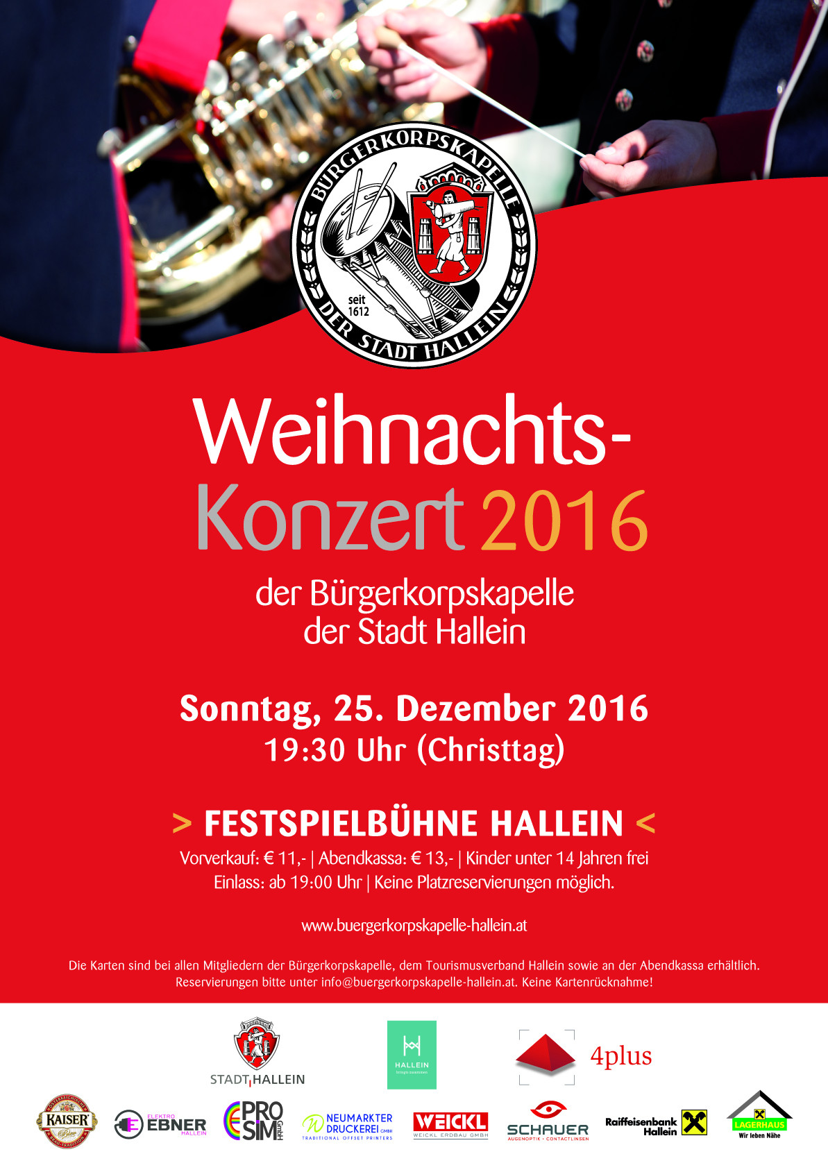 Karten: Die Karten sind bei den Musikerinnen und Musikern der Bürgerkorpskapelle, dem Tourismusverband Hallein, sowie an der Abendkassa erhältlich. Reservierung bitte unter: info@buergerkorpskapelle.hallein.at, VVK 11 €, AK 13 €.