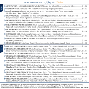 Diese CD mit dem Titel „Auf der Suche nach dem Klang des Friedens“ bietet abwechslungsreiche Advent- und Weihnachtsmusik. Der Tonträger wurde sowohl von der gesamten Bürgerkorpskapelle Hallein, verschiedenen Besetzungen für Holz- und Blechblasinstrumente, einer Saitenmusik und der Hia&Do Brass eingespielt. Weiters wirkten der Schulchor des BG/BRG, ein Schüler-Ensemble des Musikums sowie Sängerinnen aus Hallein und der Tenor Matthäus Schmidlechner mit. Hören sie stimmungsvolle Weisen, Wiegenlieder und Hirtenmusik. Mit einer neuen Weihnachtsgeschichte aus Hallein sowie verschiedenen Versionen von „Stille Nacht, heilige Nacht“ präsentiert die Bürgerkorpskapelle Hallein mit dieser CD ihren Beitrag zum Jubiläumsjahr 2018.